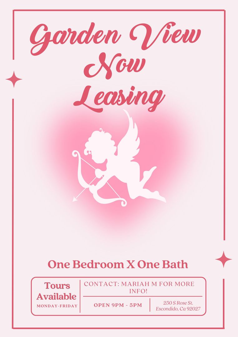 Fall in love with comfortable living at Garden View Apartments, a peaceful hillside community nestled in Escondido. This charming one-bedroom, one-bath apartment is thoughtfully designed for easy living—perfect for anyone ready to find their perfect match.